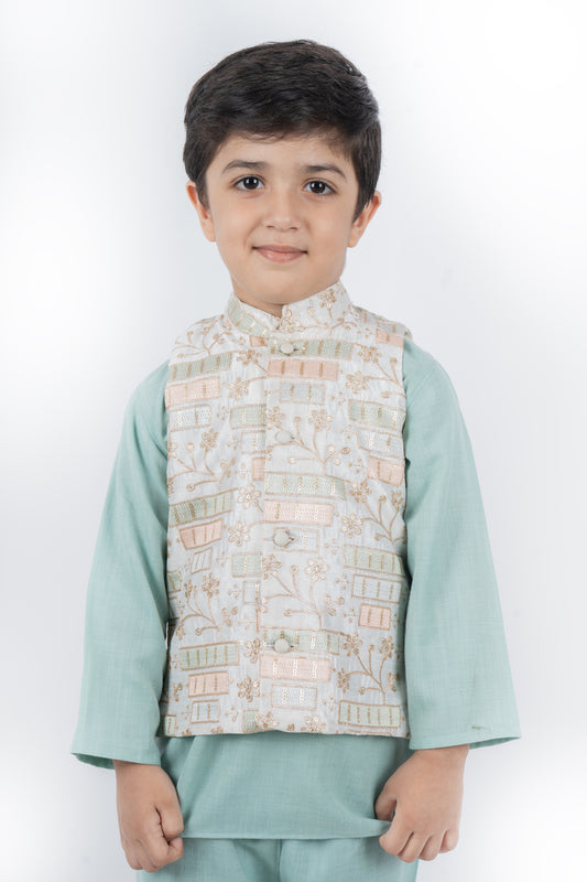 Ivory Nehru Jacket with Beautiful Pastel Colored and Gold Threadwork with a Blue Kurta Pyjama