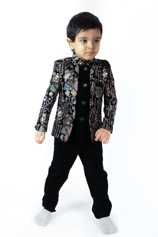 Black Sherwani Set with Multicoloured Threadwork