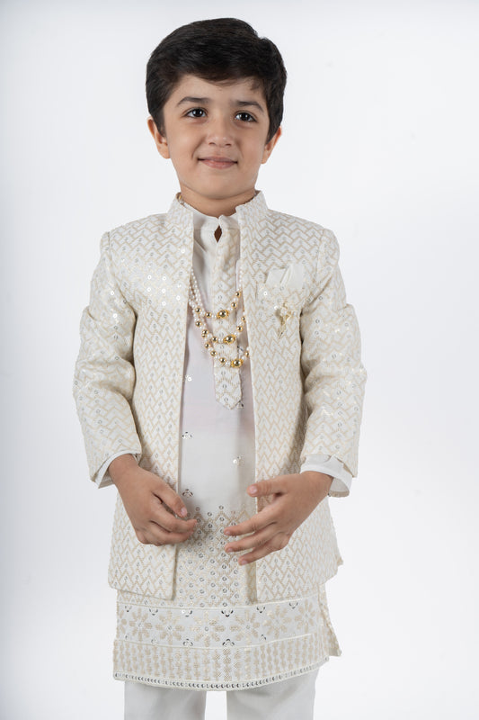 Ivory Kurta-Sherwani Set with Beautiful Golden Threadwork and Silver Buttis