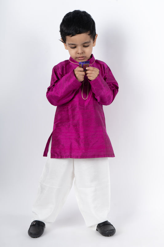 Magenta Raw Silk Kurta with a Silk Off-White Pyjama
