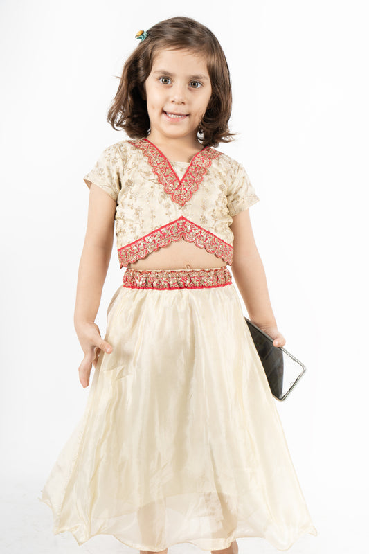 Ivory Lehenga Set with a Golden Threadwork Top with Pink Lace Detailing