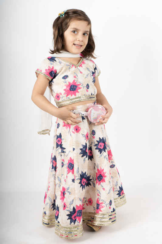 Floral Printed Cotton Lehenga with Silver Lace Detailing