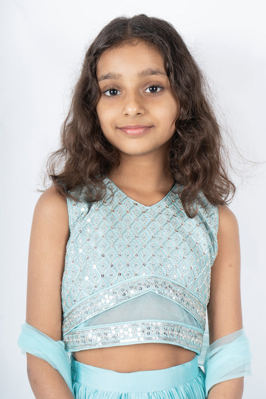 Top and Lehenga in Light Blue, Fully Embroidered with Sequins and Silver Threadwork