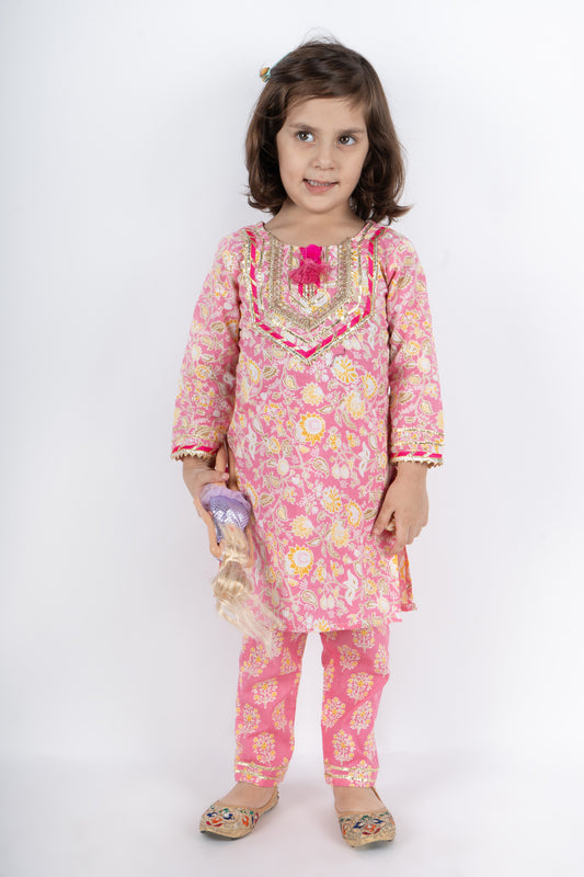 Pink Pure Cotton Printed Kurta with a Pink Printed Cotton Pyjama